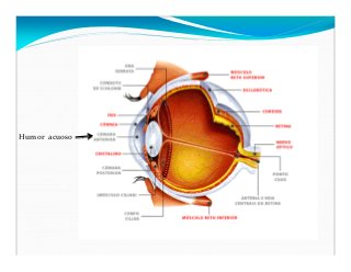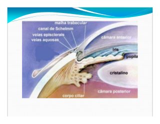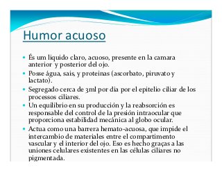 - 16. Humor acuoso És um liquido claro, acuoso, presente en la camara anterior y posterior del ojo. Posse água, sais, y proteinas (ascorbato, piruvato y lactato). Segregado cerca de 3ml por dia por el epitelio ciliar de los processos ciliares. Un equilibrio en su producción y la reabsorción es responsable del control de la presión intraocular que proporciona estabilidad mecánica al globo ocular. Actua como una barrera hemato-acuosa, que impide el intercambio de materiales entre el compartimento vascular y el interior del ojo. Eso es hecho graças a las uniones celulares existentes en las células ciliares no pigmentada.