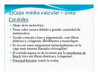- 11. 2)Capa média vascular – úvea Coróides Abajo de la esclerótica. Tiene color oscura debido a grande cuantidad de melanocitos. Tecido conectivo laxo y pigmentado, com fibras elásticas y colágenas, fibroblastos y macrofagos. És rica en vasos sanguineos (principalmente en la capa mais interna llamada coriocapilar) El coróide separa-se de la retina por la membrana de Bruch (rica em fibras elasticas y colagenas). Principal función: nutrir la retina