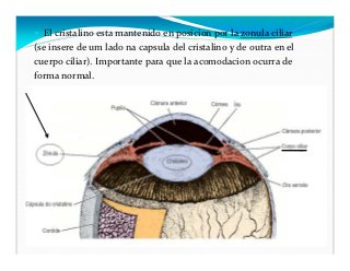 - 21. El cristalino esta mantenido en posicion por la zonula ciliar (se insere de um lado na capsula del cristalino y de outra en el cuerpo ciliar). Importante para que la acomodacion ocurra de forma normal.