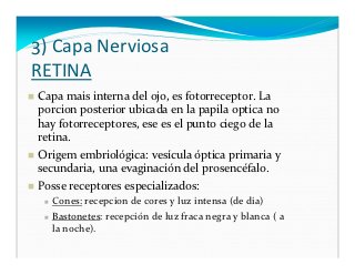 - 23. 3) Capa Nerviosa RETINA Capa mais interna del ojo, es fotorreceptor. La porcion posterior ubicada en la papila optica no hay fotorreceptores, ese es el punto ciego de la retina. Origem embriológica: vesícula óptica primaria y secundaria, una evaginación del prosencéfalo. Posse receptores especializados: Cones: recepcion de cores y luz intensa (de dia) Bastonetes: recepción de luz fraca negra y blanca ( a la noche).