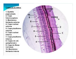 - 24. Capas de la retina: 1. Epitélio pigmentario 2. Capa fotorreceptora 3. Membrana limitante externa 4. Capa nuclear externa 5. Capa plexiforme externa 6. Capa nuclear interna 7. Capa plexiforme interna 8. Capas de cél. ganglionares 9. Capa de fibras nervosas 10. Membrana limitante interna