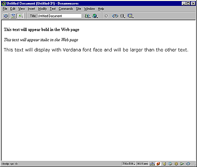 <b>This text will appear bold in the Web page</b>. <i>This text will appear italic in the Web page</i>. <font face="verdana" size="2">This text will display with the Verdana font face and will be larger than the other text.</font>