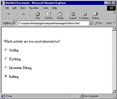 Radio buttons work as a group and provide mutually exclusive selection values. Only one option in a radio button group may be selected.