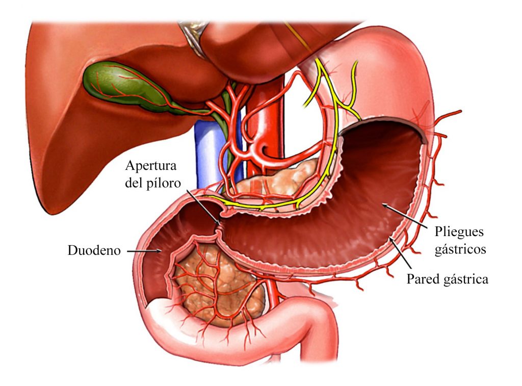 La inervación del estómago procede del nervio vago, parasimpático y del nervios simpáticos que acompañan a los vasos arteriales.